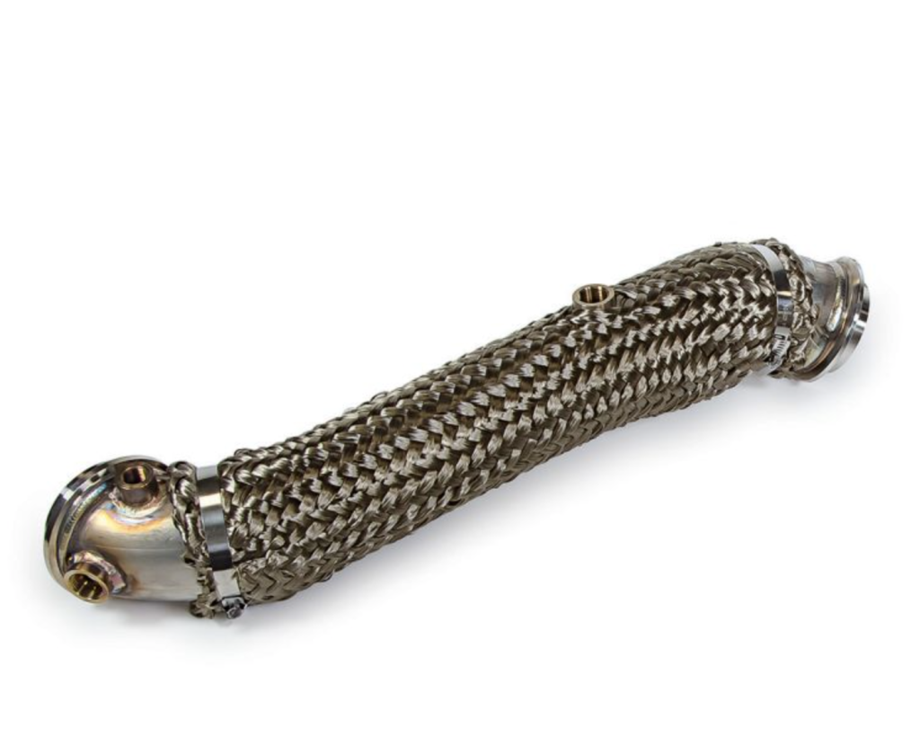Remove your crushed oval stock down pipe and replace it with a smooth round, long lasting, 304 stainless steel down pipe. Spiral wrapped with titanium woven thread for superior heat held in place with a couple of stainless steel clamps This PPE product is an OEM replacement and when used, allows your engine to maintain factory standards.